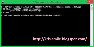 - Pada menu command prompt tersebut ketik perintah adb install BBM.apk